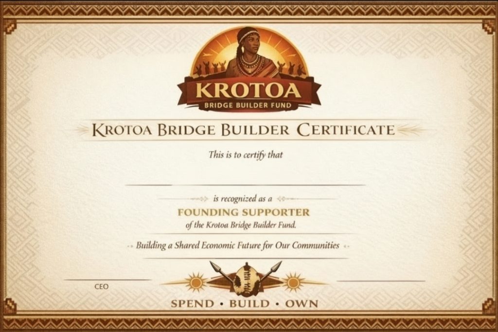 The Krotoa Bridge Builder Fund is a structured community capital initiative designed to launch and scale the Krotoa ecosystem-a fintech-enabled economic platform connecting everyday spending to shared ownership and community wealth creation.  The fund will activate technology, expand manufacturing and create retail partnerships to create jobs in communities.